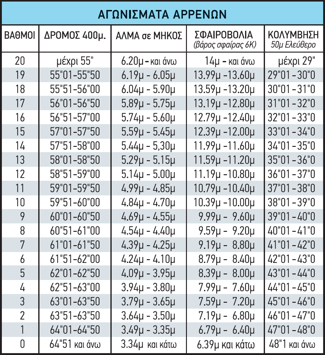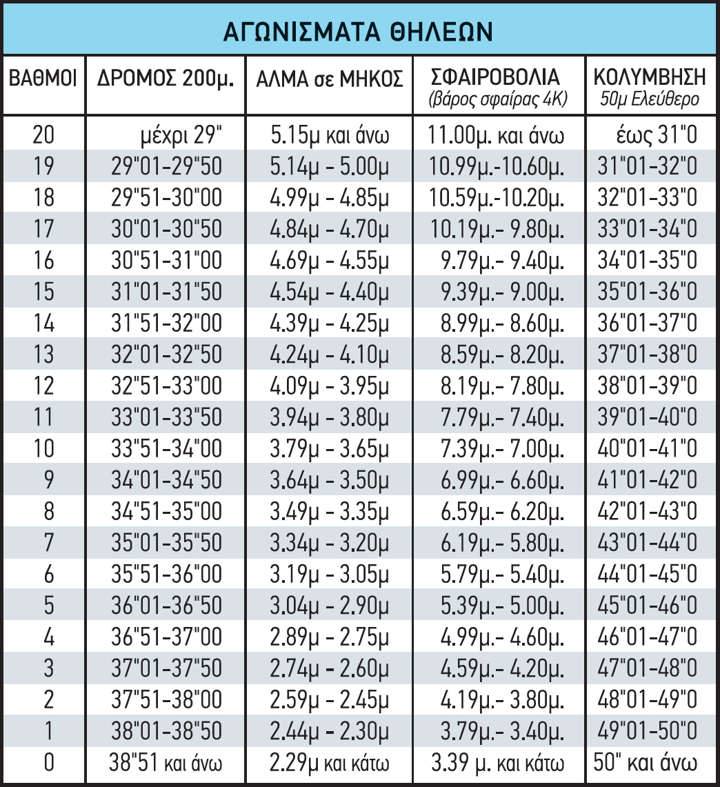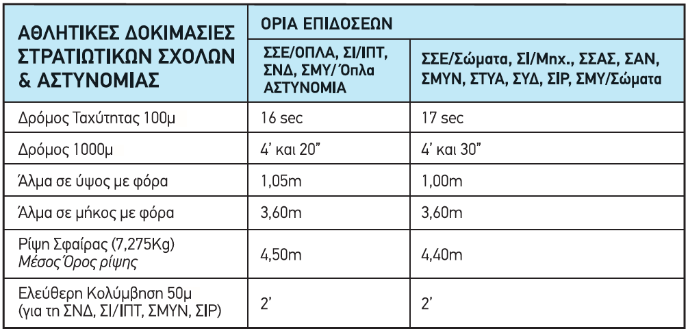 Στον παρακάτω πίνακα βλέπετε τα αγωνίσματα, καθώς και τα κατώτατα όρια που πρέπει να πετύχει ο υποψήφιος (ανεξαρτήτως φύλου) για να κριθεί κατάλληλος.